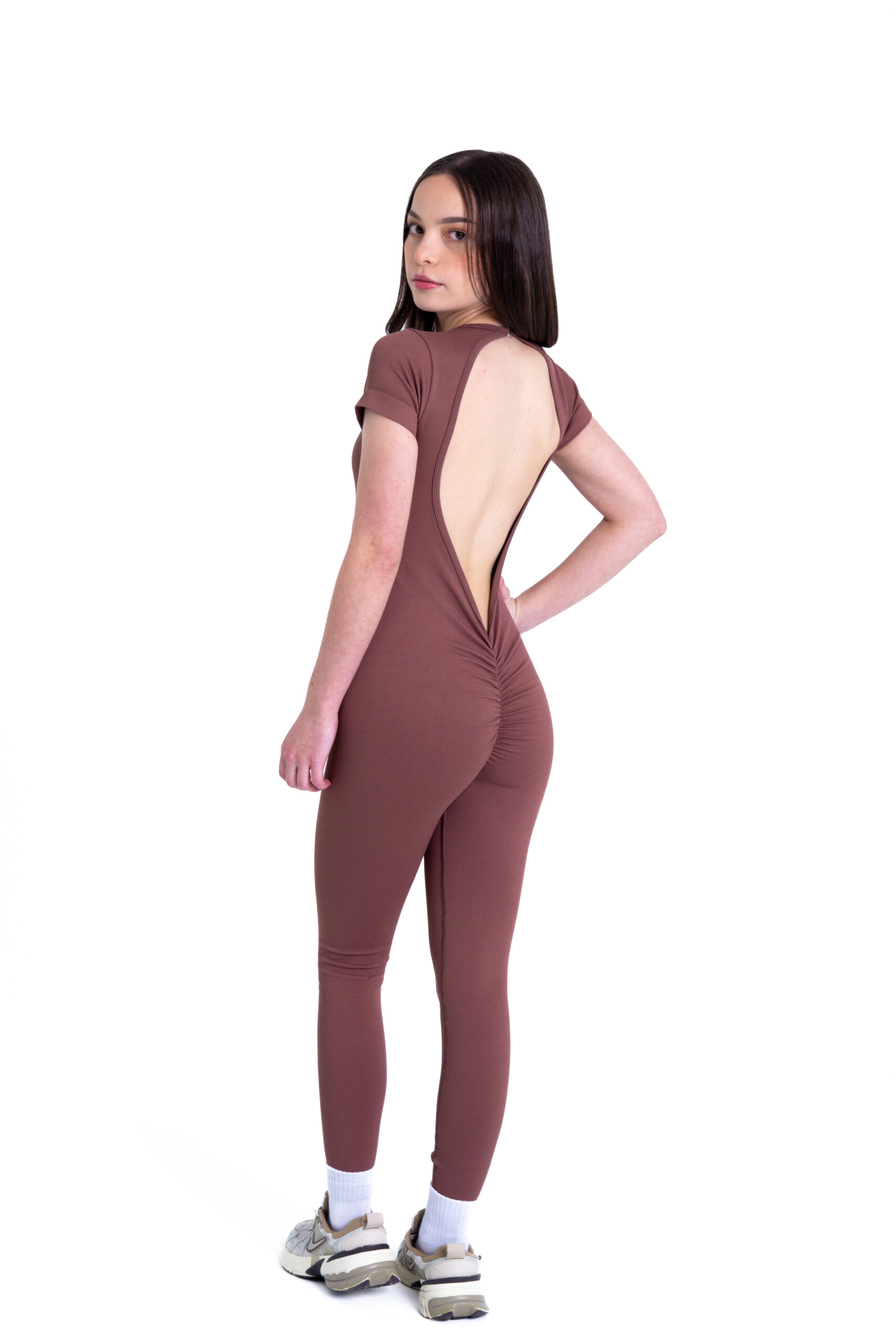 Enterizo con realce en glúteos y espalda descubierta en V. Cuenta con broche posterior para mayor comodidad y realce interno que aporta durabilidad y soporte. Talla única, se adapta desde una S hasta una L.