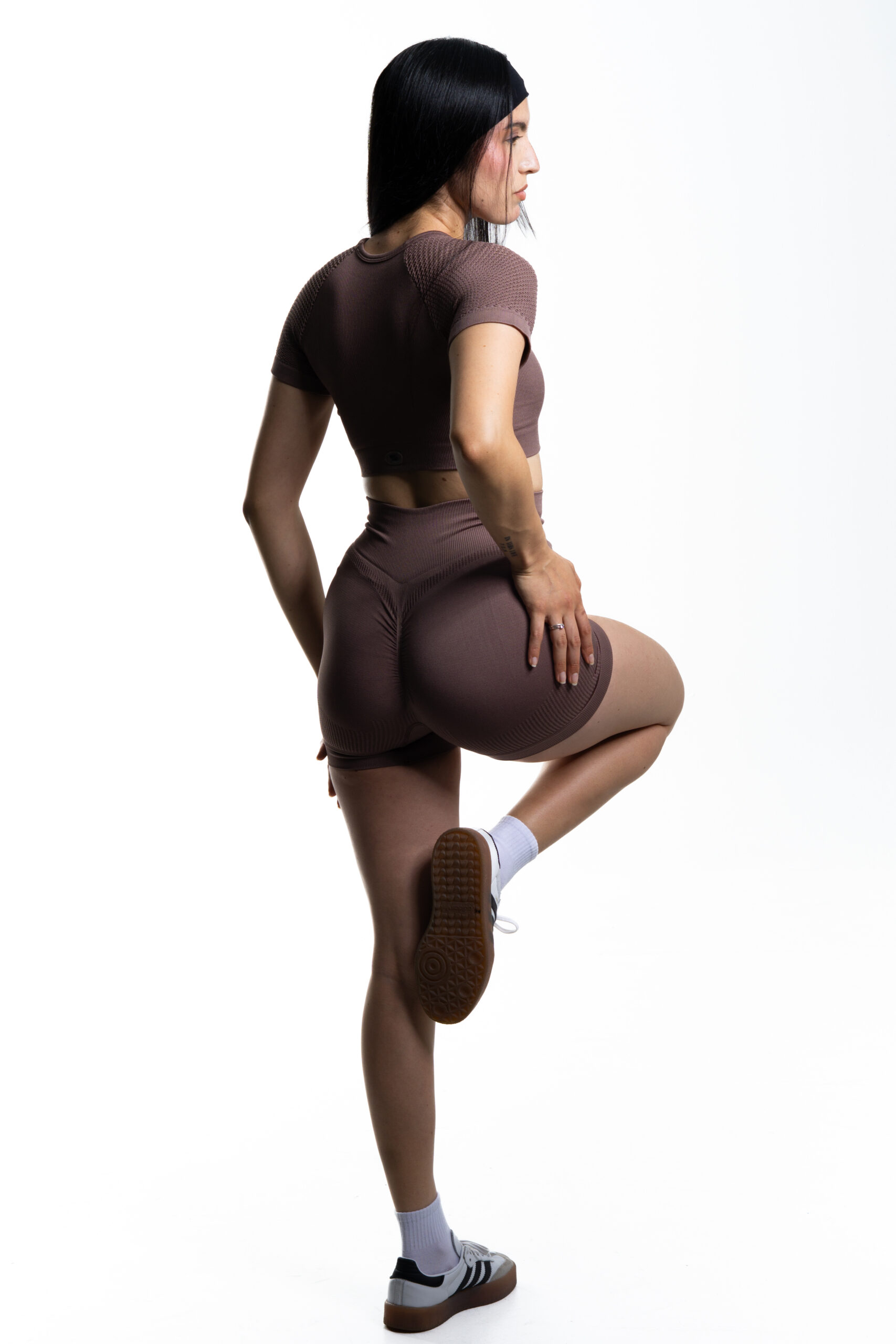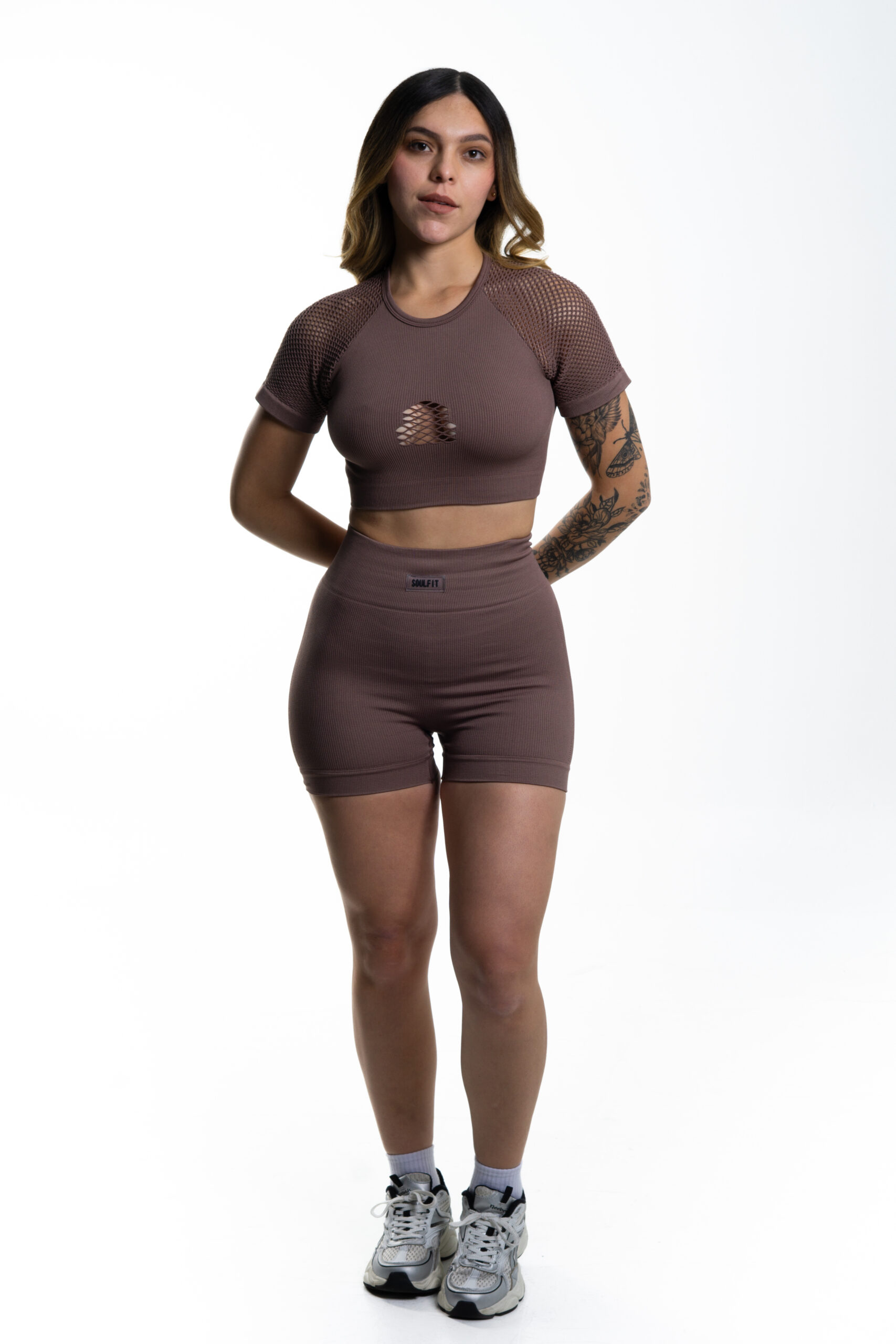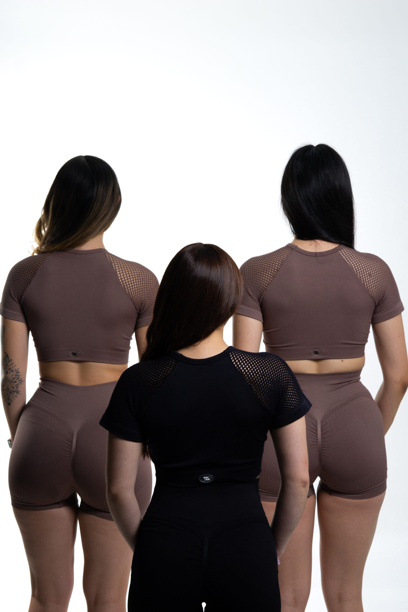 La blusa cuenta con mangas cortas en malla y un sutil escote frontal también en malla, lo que le da un toque sofisticado y vanguardista. El short está confeccionado en tela acanalada de alta calidad, con realce en glúteos para una silueta más definida y favorecedora.