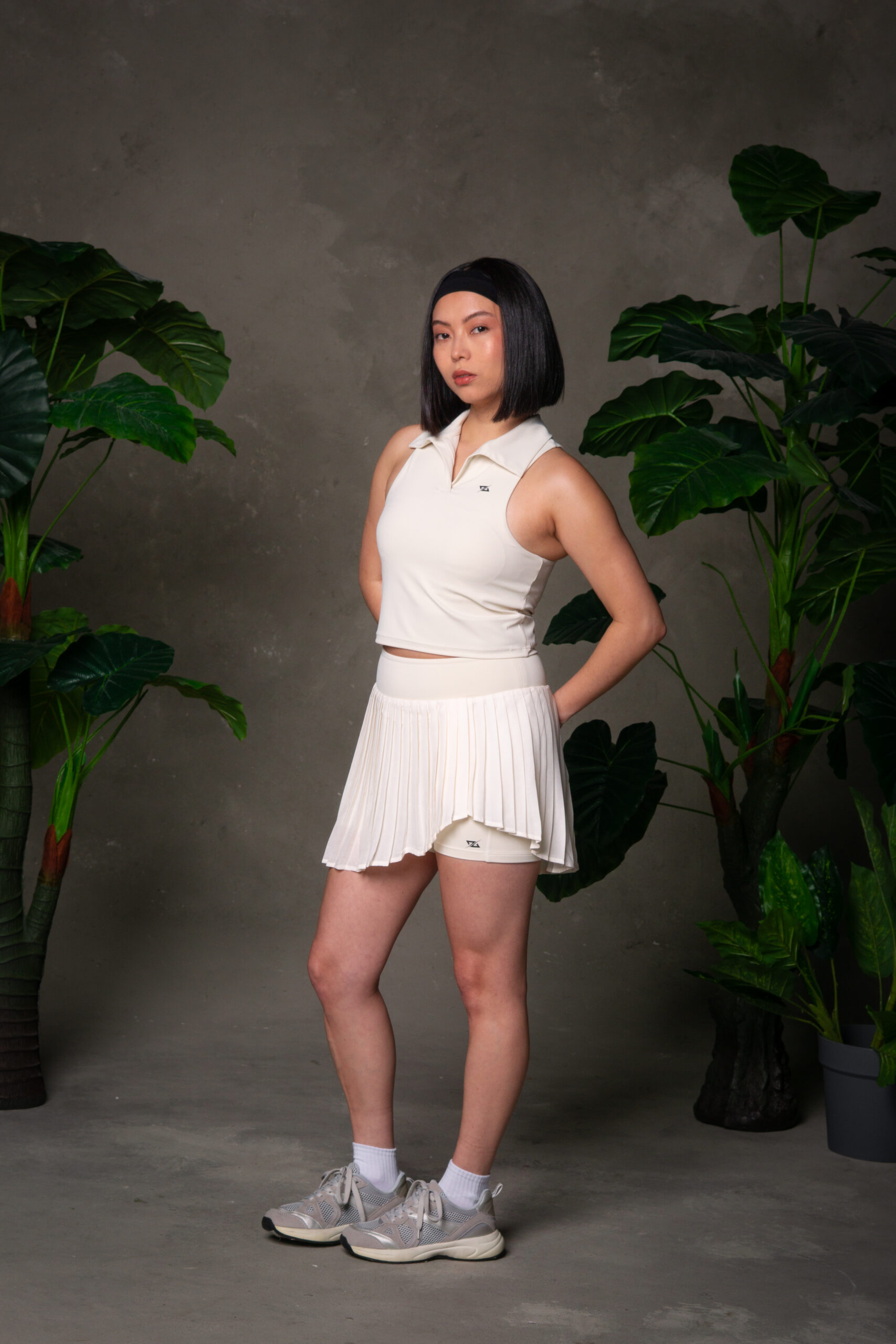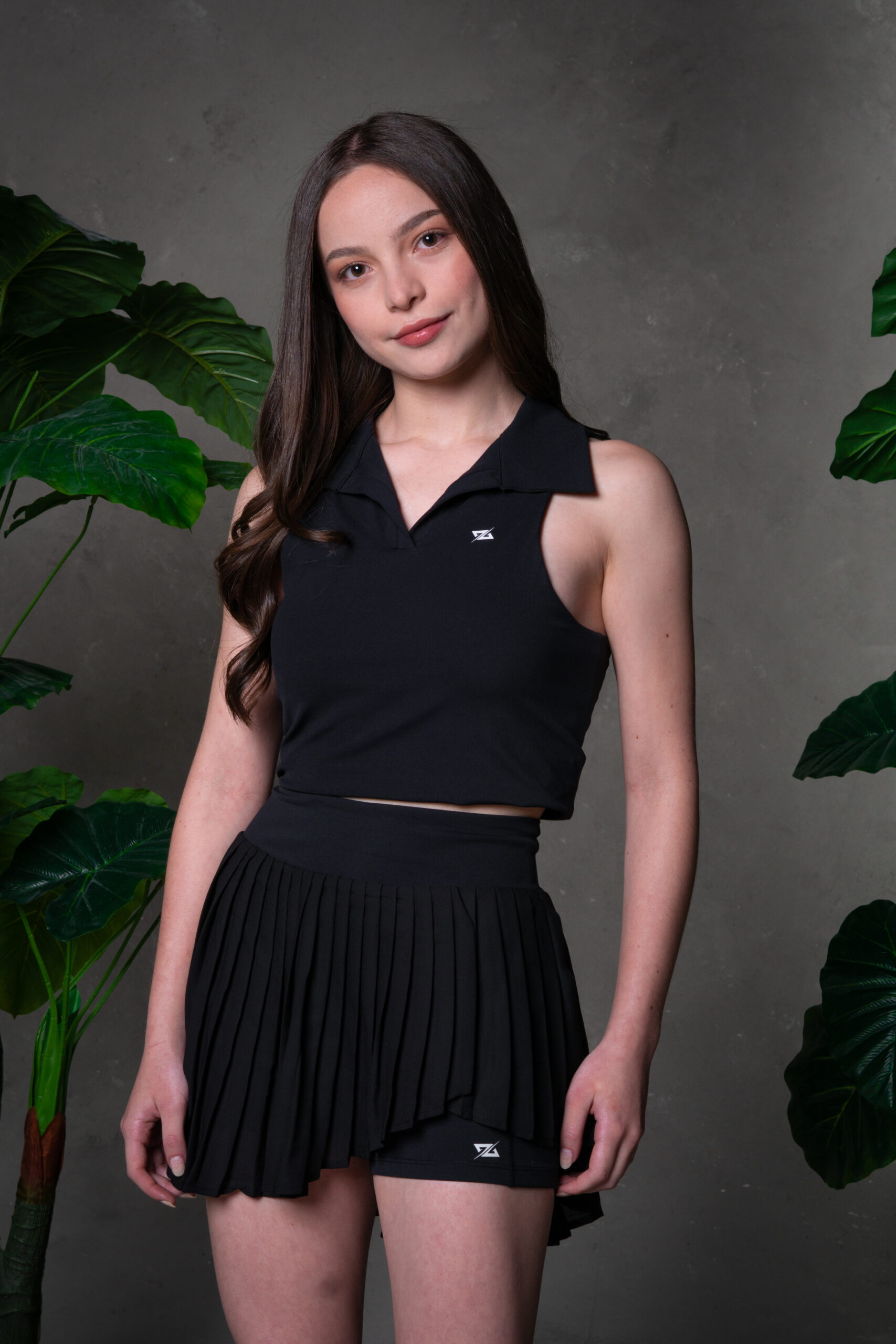 Conjunto en tela premium que incluye una blusa tipo polo con copas removibles y una falda con pretina que ofrece una caída espectacular. Disponible en tallas S y M.